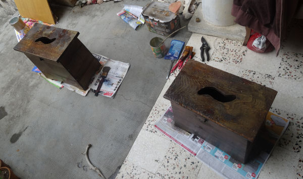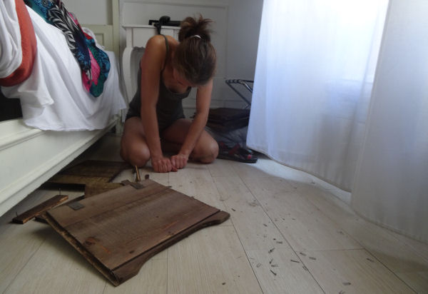 Le dimanche matin, armée d’une pince à épiler et d’un couteau à beurre, Anti a soigneusement démonté les deux tabourets. Je l’ai un peu aidée à retirer quelques clous enfoncés dans le bois, sans aucune pince ni marteau bien sûr. Il ne restait plus qu’à caser tout ça dans sa valise et mon sac de voyage, à glisser nos affaires là où on pouvait, à passer les contrôles à l’aéroport, à tout remonter une fois arrivés à la maison (cette fois avec des vrais outils) et à leur redonner une nouvelle jeunesse avec un peu de lasure.