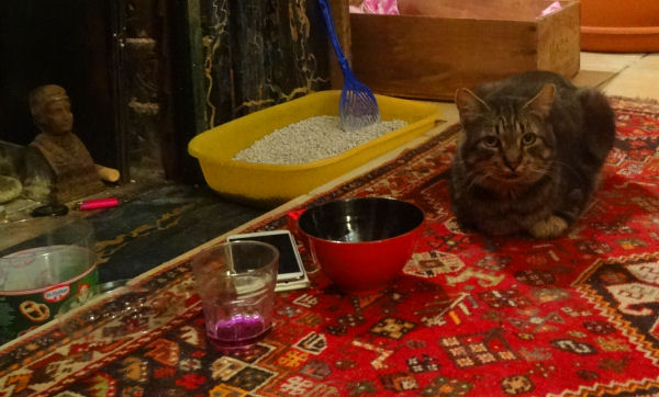 Depuis quelques semaines, on le voit absolument tous les jours. Il se laisse maintenant très facilement caresser et il adore ça, bien sûr. Avant-hier soir, il est passé prendre l’apéro avec nous, devant la cheminée. Ses coussinets brûlés cicatrisent tout doucement, ça semble interminable mais aucun doute, il y a une amélioration.