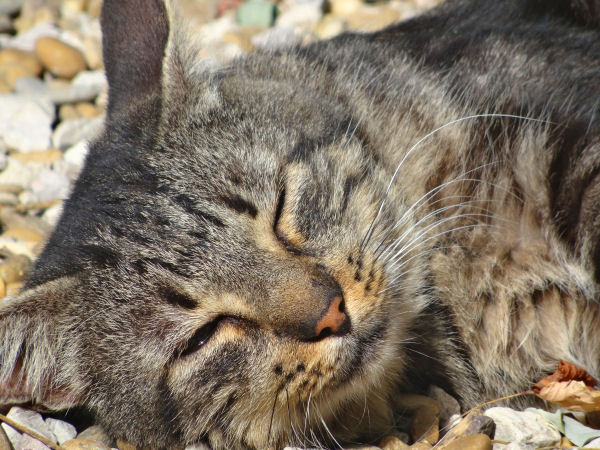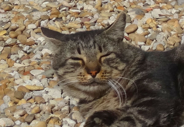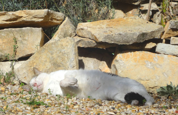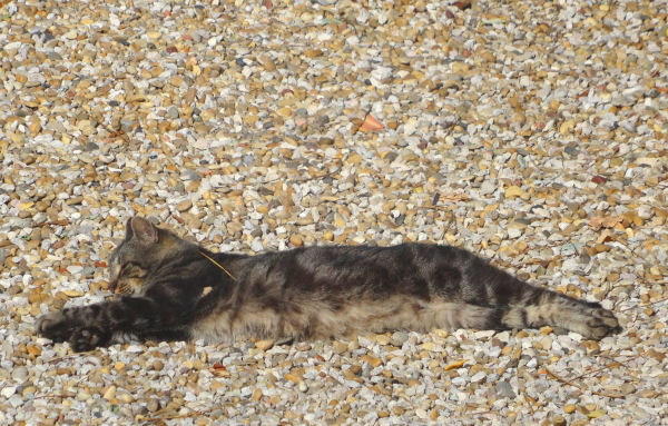 Hier, profitant d’un milieu de journée ensoleillé et chaud, il s’est laissé aller à paresser sur le gravier, juste au pied de l’escalier, s’étirant et se roulant avec délice. Un peu plus loin, Charlot n’était pas en reste.