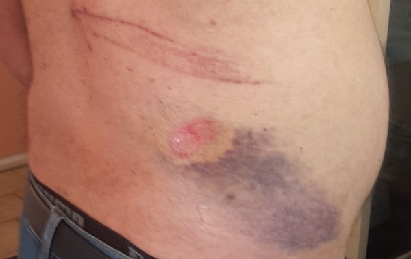 Hier, Anti m’a ramené chez notre médecin avec mes radios, supposées démontrer que je n’avais aucune fracture. Comme il avait un doute sur un petit défaut à peine visible sur l’une de mes côtes et que je lui disais que j’avais surtout mal nettement en-dessous du point d’impact visible, il m’a demandé de retirer mon t-shirt. Et là, Anti a poussé un grand cri : pour un grand bleu, c’était un grand bleu.