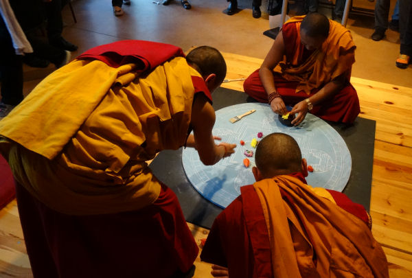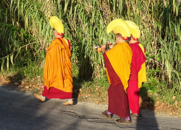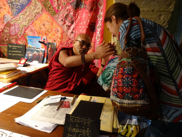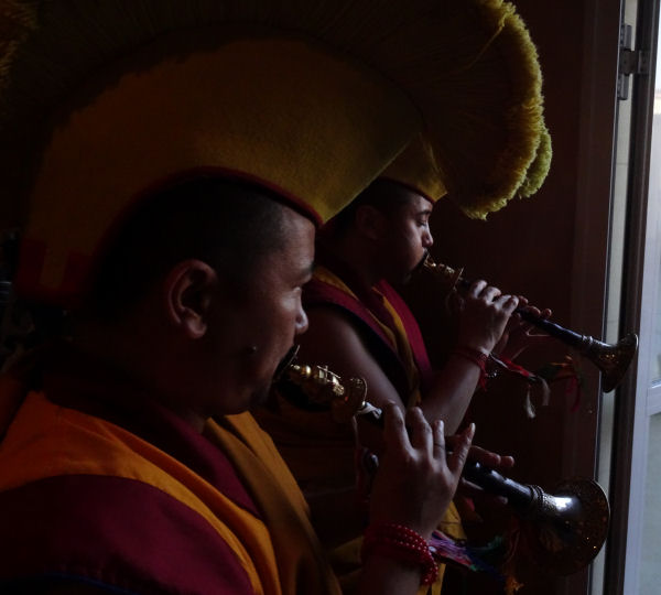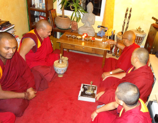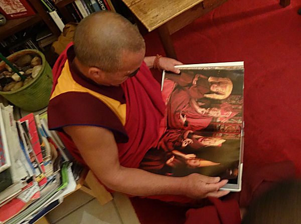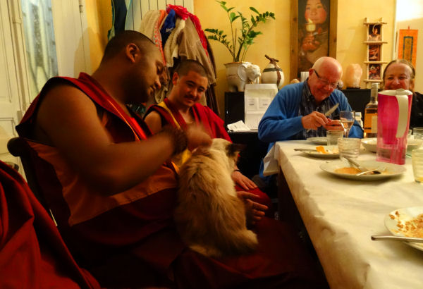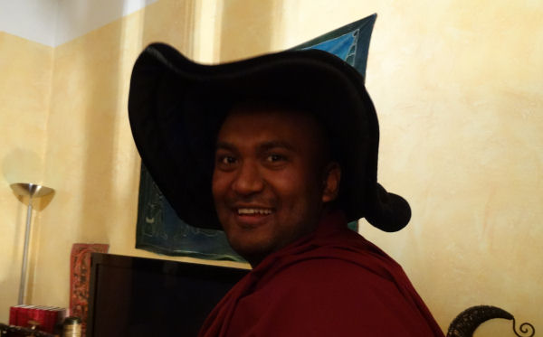 Hi hi hi j’ai pensé à toi ! C’était très drôle : à un moment, après le repas, il a repéré le fameux chapeau et il a vite craqué, il se l’est mis sur la tête, très content ! Il a dit : « Mahakala ! », du nom d’une divinité protectrice très importante pour les bouddhistes tibétains, habituellement représentée en noir.