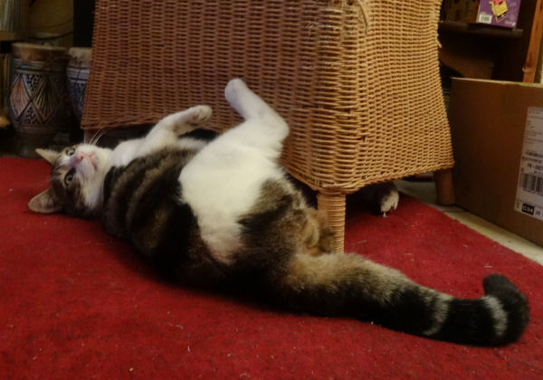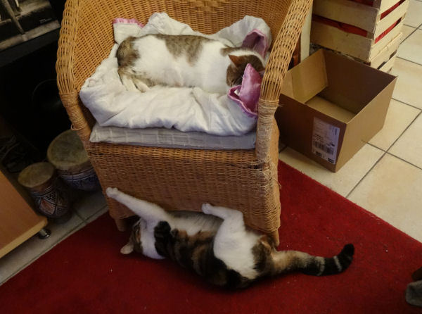 Je ne pense pas déjà vous avoir parlé de la façon très particulière que notre Maley adopte lorsqu’il veut faire une petite sieste près du coin télé. Il s’installe le long du fauteuil en osier, sur le dos, les pattes en l’air plus ou moins accrochées sur la base du fauteuil.