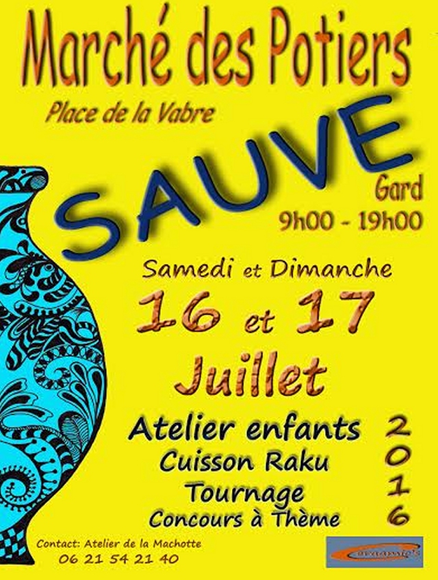 Cette année encore, notre amie potière Nadine Bailly (atelier de la Machotte) organise le Marché de Potiers de Sauve. Elle vous donne rendez-vous pour la 3e édition qui va se dérouler ce week-end, samedi 16 et dimanche 17 juillet 2016, place de la Vabre, dans la jolie ville de Sauve.