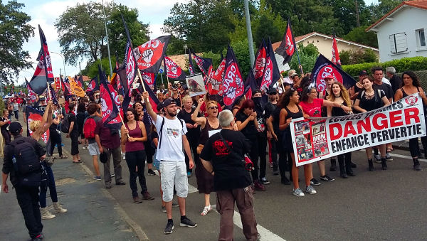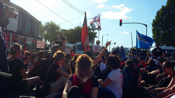 Il était 19 h 30 et il a été proposé aux militants de revenir vers le parking de départ puisque la manifestation devait être dissoute à 20 h. Lorsque les bus ont commencé à se présenter, les militants n’étaient absolument pas décidés à jouer le jeu pourri imposé par la préfecture au mépris de la loi et surtout de leur sécurité. Ce n’est que vers 21 h que la plupart des bus ont fini par partir, les manifestants acceptant finalement de monter à bord, sous la menace d’être arrêtés et réprimés par des amendes pour cause de « rassemblement illégal ».