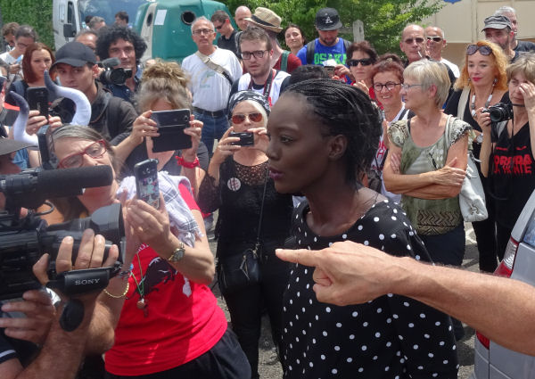 Vers 14 h 30, Rama Yade a rejoint les manifestants déjà arrivés sur le parking qui nous servait de point de rendez-vous. Elle a été accueillie par une ovation et a semblé nettement touchée par notre enthousiasme à la voir parmi nous. Malgré les violentes attaques qu’elle a subies de la part de porte-voix de l’aficion, elle n’a pas reculé.
