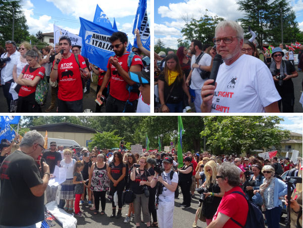 Walter Caporale (Animalisti Italiani) a dit à quel point il était important pour nos voisins italiens d’être présents avec nous. Il en a été de même pour Marius Kolff, président de CAS International et membre du bureau du Réseau International Antitauromachie (RIA), dont le CRAC Europe fait partie depuis 2007. Ont également parlé Alain Perret (Les Exclus Sauvages), Jean-Marc Governatori (AEI) à qui nous devons la venue de Rama Yade, Sacha Doligé (Rassemblement éco-citoyen du Gers), Carole Saldain (EHBAC) et Catherine Désert, cette dernière sur la question des liens entre corrida et église catholique, en opposition frontale avec les préceptes de base de cette religion. Rita Silva (Animal, Portugal) a ajouté ses propres mots de soutien plus tard dans l’après-midi, étant arrivée tardivement en raison de barrages policiers.