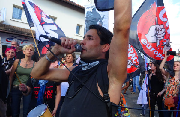 Le micro a ensuite circulé librement parmi les manifestants, permettant à quiconque le souhaitait de s’exprimer. Certaines interventions ont été particulièrement fortes et émouvantes. Citons en particulier celle d’une Niçoise rescapée de justesse du massacre du 14 juillet qui a apostrophé les policiers en leur disant qu’à Nice, elle n’en avait vu aucun que le camion conduit par un fou a tué ses 84 victimes, alors qu’ils étaient là en force, face à nous qui étions pacifiques et ne présentant aucun danger pour la vie de personne. Une autre leur a demandé pourquoi ils étaient en tenue de combat, casqués, alors que nous n’avions que des t-shirts et des savates – ils ont fini par retirer leur casque, visiblement piteux.