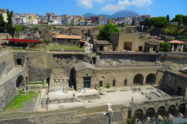 Pompéi a été ensevelie sous des cendres et des pierres incandescentes retombant de l’immense nuage qui s’est élevé jusqu’à 18 km d’altitude lors de l’éruption du Vésuve en 79 de notre ère. Herculanum (devenue Ercolano en italien) a connu un sort très différent. Elle a été noyée sous une couche de boue brûlante de vingt mètres d’épaisseur dévalant depuis les pentes du Vésuve situé à une quinzaine de kilomètres de là. La ville actuelle s’est bâtie par-dessus et elle surplombe tout le site de fouilles, ce qui donne une sensation saisissante de l’épaisseur de la zone recouverte.