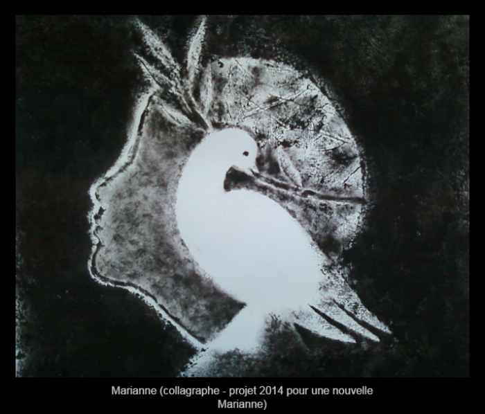 Ayant pu explorer ces dernières années les différentes techniques de gravure, et en particulier les monotypes, il m’a paru intéressant de tenter de restituer l’atmosphère onirique du texte par le biais de ces estampes en noir et blanc où l’encre joue avec le papier de façon aléatoire et permet de créer des effets aussi heureux qu’inattendus.
