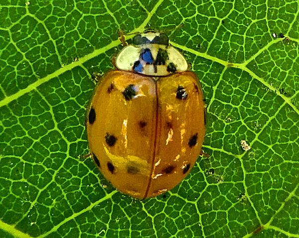 Hier, en milieu d’après-midi, nous en avons croisé une fort jolie, qui vaquait à ses occupations sur une feuille d’arbre de Judée. Les coccinelles asiatiques peuvent avoir un nombre de points allant de zéro à dix-neuf et adoptent toutes sortes de couleurs, y compris le rouge ou, plus rare, un bleu profond qu’on peut voir en Nouvelle-Zélande ou en Australie.