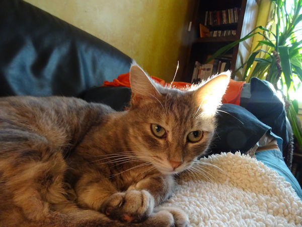 Il aura fallu 2 ans pour que je parvienne à la caresser et un an de plus pour qu’elle soit de plus en plus détendue. Maintenant, elle est complètement sous le charme d’Anna. Trop drôle la petite Crevette sous les grosses papattes d’Anna 🙂