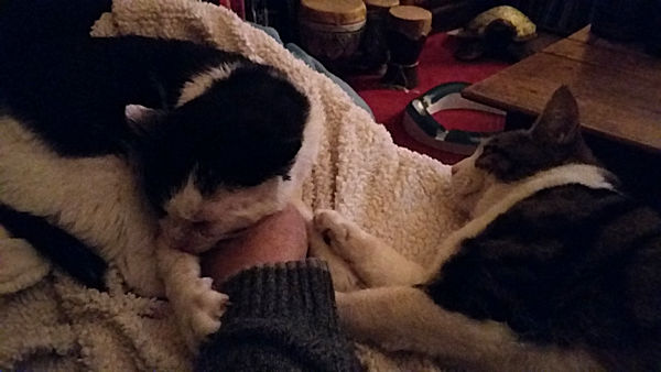 Je tends la main pour les caresser et là, Tanguy me l’attrape fermement des deux pattes avant et pose ensuite sa tête dessus avant de se rendormir en ronronnant.