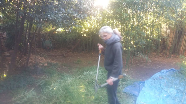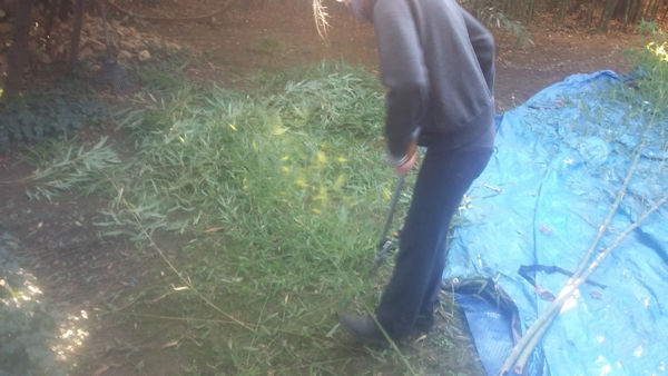 Cette fois-ci, grâce à Super Anti, on a mis en place un système bien plus efficace : un entrelacement de bambous rendant toute accumulation d’eau de pluie impossible à la surface de la bâche. Reportage en quelques photos… Il faut commencer par couper toutes les branches secondaires des bambous abattus.
