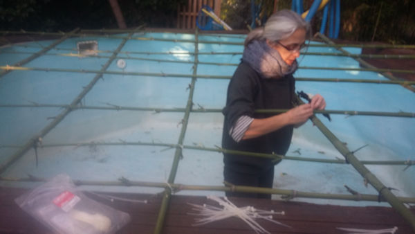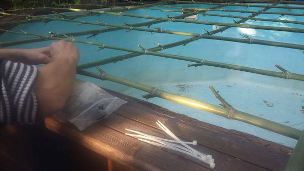 Les bambous sont entrecroisés et liés entre eux avec des serre-flex pour que l’ensemble reste bien rigide :