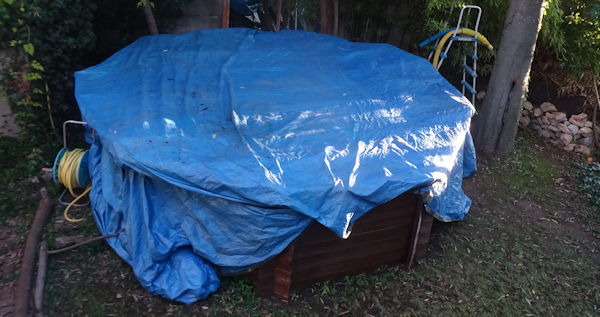 Il y a quelques jours, Anti a nettoyé le fond de la piscine où croupissait une eau devenue marron à cause de la végétation tombée au fond. Restait à la recouvrir pour la mettre à l’abri des pluies et des chutes de feuilles mortes dans les mois à venir, jusqu’au retour des beaux jours. Les années précédentes; j’avais bricolé des bidules vraiment pas géniaux pour mal soutenir une bâche qui se remplissait vite de grosses poches d’eau pas très ragoûtantes.