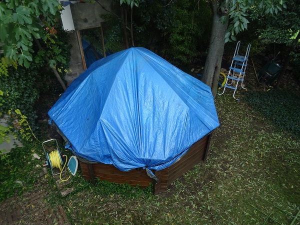 Vous vous souvenez peut-être de notre atelier bambou qui avait abouti à un entrelacement desdits bambous pour soutenir une bâche de protection de la piscine vide contre les pluies. Hé bien, dès la première grosse averse, la technique s’est révélée insuffisamment solide puisqu’une importante poche d’eau s’est accumulée en déformant la structure. Le tout a tenu grâce à la bâche fermement accrochée au rebord en bois de la piscine grâce à des sangles, mais l’ensemble aurait rapidement fini par céder face aux mois d’hiver qui s’annoncent.