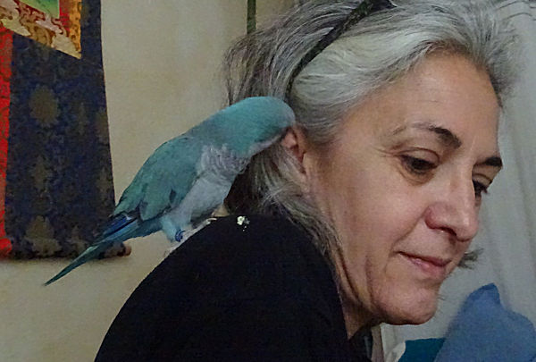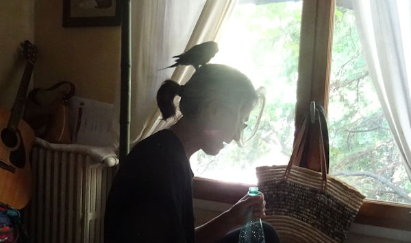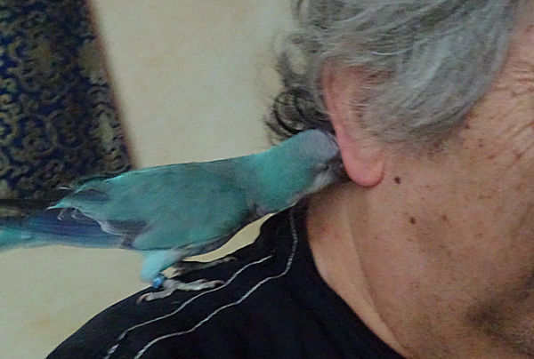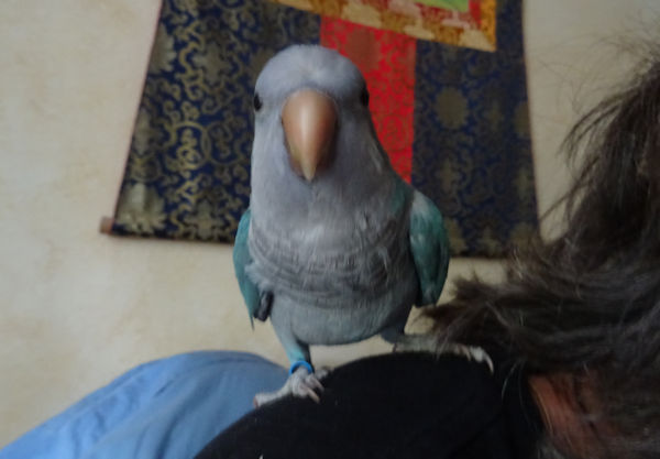 Nous avons passé plusieurs heures avec lui en liberté dans notre chambre, pendant lesquelles il s’est régalé à passer d’une épaule à une autre en poussant des cris joyeux, voire à nous picorer ce qu’il pouvait, comme mes poils de barbe. Et il passe beaucoup de temps à se toiletter, plus qu’un chat.