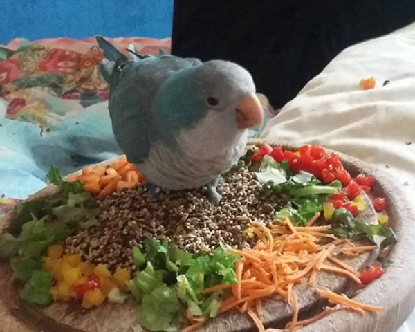 Surtout, elle a découvert sur un site très fourni que les quakers adorent les crudités comme les carottes, la salade et les poivrons crus. Elle a aussitôt préparé une superbe assiette pour le pioupiou qui ne s’est pas fait prier. Il a montré une préférence pour le poivron jaune et les carottes râpées.