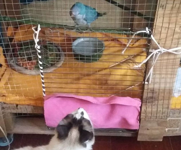 Anti a adapté le contenu de la grande cage de socialisation pour la transformer en abri bien plus confortable que la petite cage où il a passé sa première nuit. D’accord, il préfère avoir du monde, mais on ne peut pas non plus rester en permanence avec lui et au moins, là, il est à l’abri de nos raptors félins. Cela dit, lorsqu’on le laisse seul, on ferme la porte de la chambre pour qu’aucun chat ne se retrouve avec lui sans surveillance.