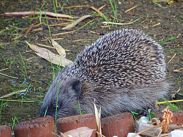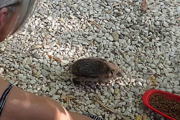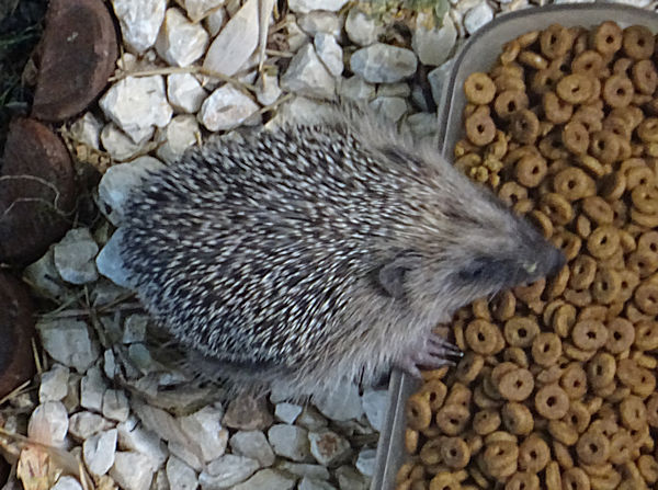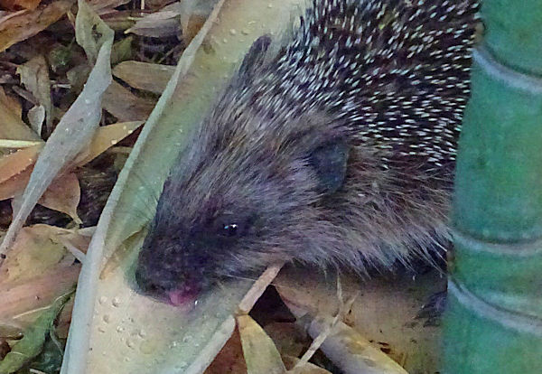Nous avons fait la connaissance, vendredi en fin de journée, du premier bébé hérisson de l’année. Il a eu droit à beaucoup plus de croquettes qu’il ne pouvait engloutir et aussi à de l’eau. En fait, il a commencé à boire dans le creux d’une feuille de bambou sèche sur laquelle un peu d’eau du système d’arrosage s’est retrouvée par hasard.