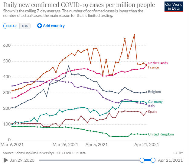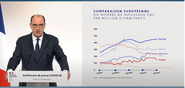 C’est avec un malaise certain que j’ai appris, comme tout le monde, que le gouvernement restait sur sa position de mettre fin graduellement au confinement dès la semaine prochaine. Au même moment, les épidémiologistes crient tous au non sens sanitaire, face à la réalité. Le Huffington Post a consacré un excellent article sur le gros mensonge par omission délivré par Jean Castex lors de sa conférence de presse du 22 avril, en accompagnant ses paroles rassurantes sur le fait que ce n’était pas pire en France qu’ailleurs en Europe, avec un graphique représentant le nombre de cas par million d’habitants dans tous les Etats-membres.