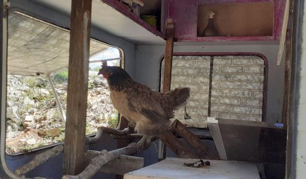 Les poules ont plusieurs beaux abris, dont une caravane en accès libre. Elles pondent quand elles veulent et où elles veulent, cela n’a rien à voir avec une exploitation. Vraiment rien à redire !