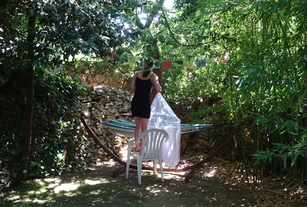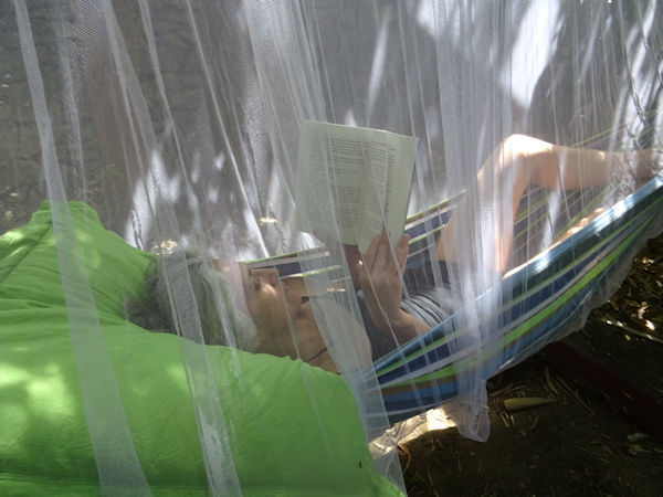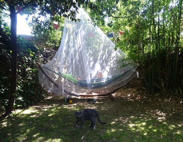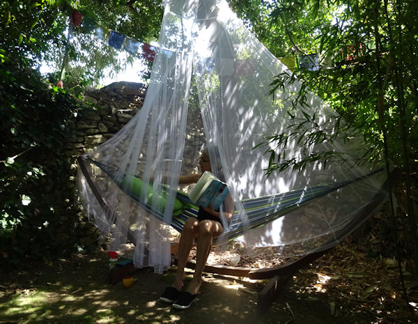 Hier, profitant d’une température idéale (28°), Anti a eu envie de passer un moment sur l’un des hamacs pour lire son livre du moment. Problème : ce hamac étant installé sur la pelouse, les petites bestioles qui piquent ne manquent pas (même si je trouve qu’il y en a vraiment très peu cette année).
