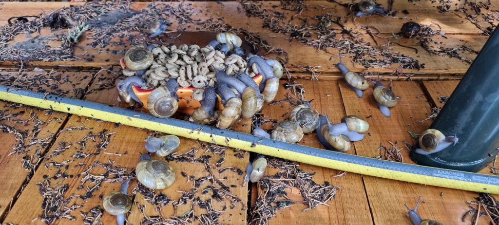 Anti a pris une photo très drôle avec une meute d’escargots ravis de cette météo et qui ont fait un festin de croquettes pour fêter ça :