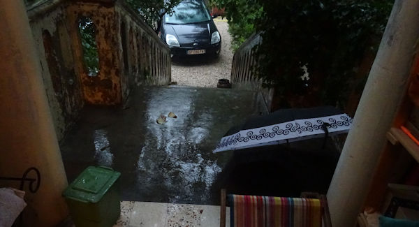 Nous avons connu hier pendant quelques heures des chutes de pluie extrêmement abondantes. Les médias ont montré des images impressionnantes. Notre maison est heureusement située à flanc de colline, un endroit où nous ne courons aucun risque (à condition d’être à l’intérieur), seul notre jardin a été bien détrempé. Quelques photos…