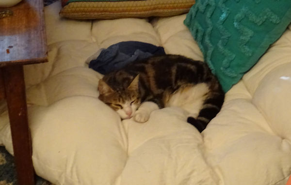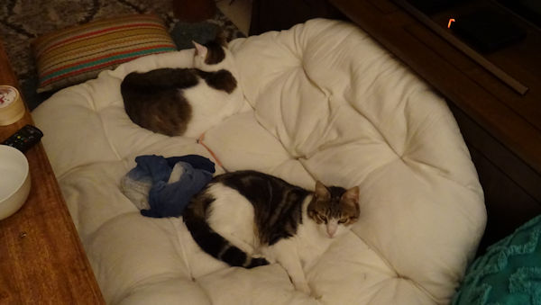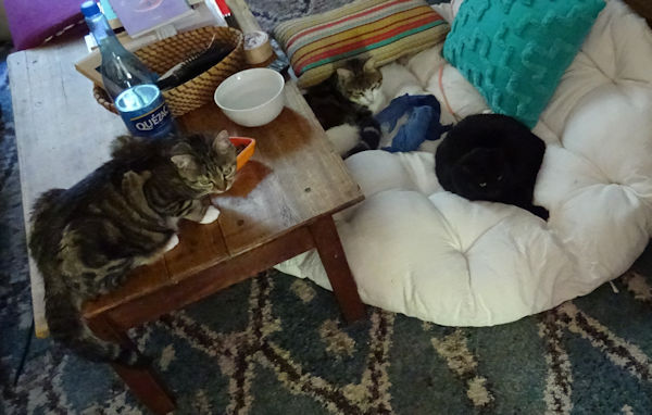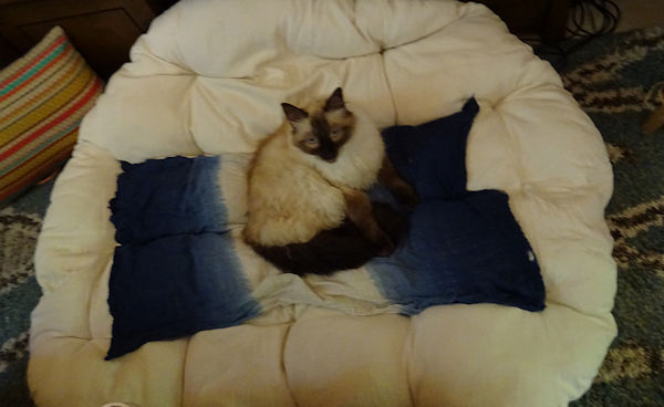 Il y a quelques semaines, Anti a acheté un beau fauteuil asiatique rond en bambou avec un énorme coussin rond aussi. Lorsque l’alerte pluie a approché, elle a mis le coussin à l’abri dans la maison. Plus précisément, au pied de la télé, endroit stratégique s’il en est pour nos chats. Ils l’ont aussitôt adopté. Quelques photos pour vous montrer :