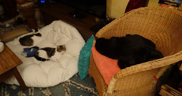 Le fauteuil en osier juste à côté garde tout de même son attrait, ici avec les amoureux Morphée et Kalinka, toujours aussi inséparables :