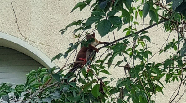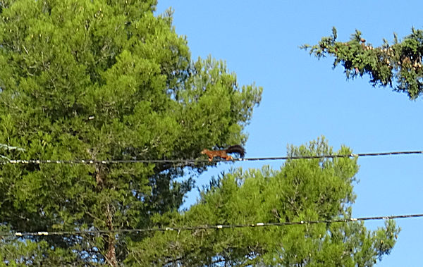 Quant à moi, la seule photo que j’ai pu prendre est de carrément loin, quand il est passé en courant sur un des fils électriques qui longent notre portail.