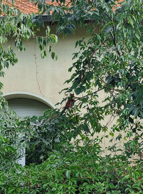 Anti a installé une petite cabane pour lui, où on mettra des noisettes et autres friandises. Pour le moment, elle est posée sur la fenêtre, on l’installera mieux un peu plus tard. Peut-être va-t-il se laisser admirer de très près ? Aujourd’hui, de grosses pluies sont prévues, il faudra probablement attendre le retour du soleil pour avoir à nouveau une chance de le voir.