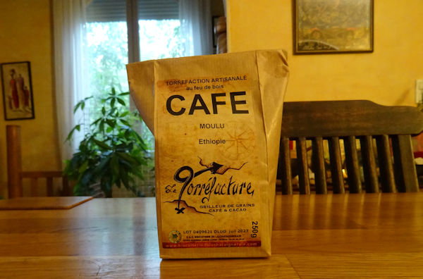 Comme vous le savez, nous sommes de fins amateurs de très bon café. Habituellement, nous consommons du moka d’Ethiopie bio, distribué par Destination. Il y a quelques temps, on n’a pas renouvelé à temps notre stock et, du coup, en attendant l’arrivée de notre commande, Anti a acheté deux autres cafés, l’un de la marque Destination mais avec un assemblage différent et un que je vous montre sur la photo ci-dessous qui est excellent, également originaire d’Ethiopie, sous la marque « La torréfacture ».