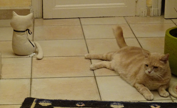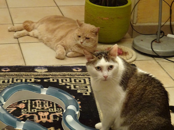 Notre cher Kiki reste la plupart du temps dans le bureau qui se trouve sous les combles. Il y jouit de tout le confort moderne : température agréable, coussins, fauteuils, tapis, nourriture, eau, litière privative et tranquillité. De temps en temps, il vient tout de même nous honorer de sa présence au niveau principal. Il reste en toutes circonstances d’une grande placidité.