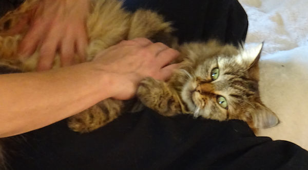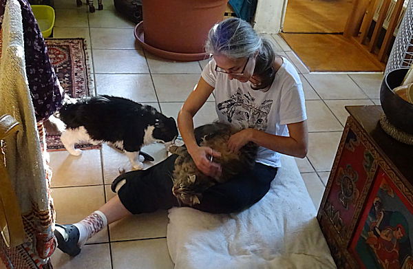 La petite Lili est totalement sous le charme d’Anti – qui est encore la seule à pouvoir la caresser et même lui administrer des médicaments. Hier, la ravissante chatounette a accepté de se laisser toiletter avec force ronrons : coiffure, coupe des touffes de poils emmêlés, caresses détente, elle a eu droit à tout.