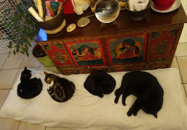 Dans la série « quand il pleut en automne on est carrément mieux sur un bon lit à l’abri », nous avons eu droit hier matin à une jolie enfilade de quatre chats sur le matelas qui leur est réservé dans notre séjour. De gauche à droite, Will, Malley, Kalinka et Morphée :