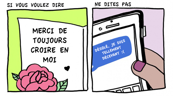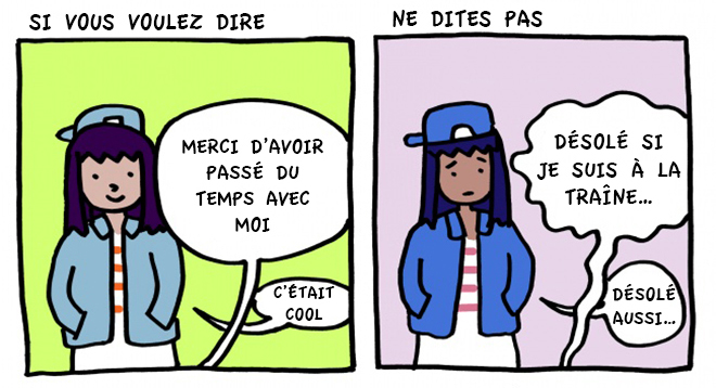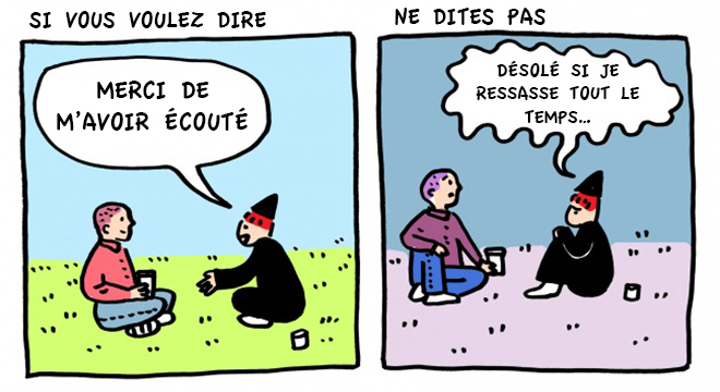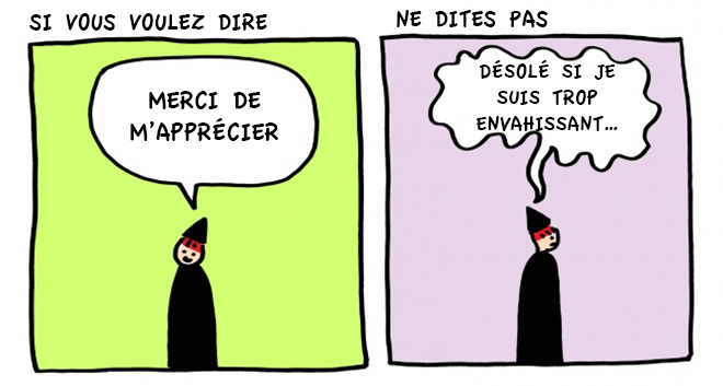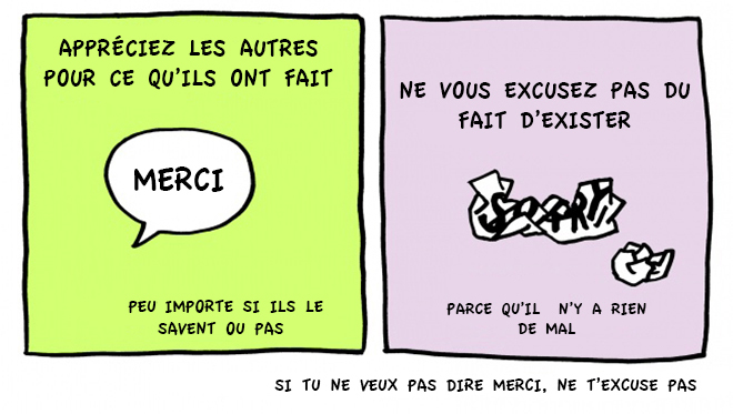 « Apprenez à dire « merci » plutôt que « désolé » : cette BD va vous changer la vie » tel est le titre d’un article paru sur Démotivateur et c’est tout un challenge, en tout cas pour moi qui ne suis pas d’humeur à être désolée en ce moment et encore moins à remercier ou alors, si, mais alors plutôt dans le sens de « congédier ». Néanmoins, je perçois le côté très instructif de la démarche, du coup, je pose ça là, histoire de savoir où le retrouver 🙂