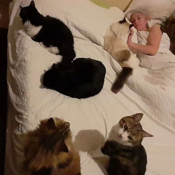 Hier soir, ils étaient à nouveau là, comme tous les soirs, mais moins nombreux (seulement quatre) et avec un accès pas trop compliqué vers ma place. Ce matin, en ouvrant les yeux, j’étais entouré de trois autres – pas les mêmes qu’au coucher – qui ont accueilli mon réveil par un concert de ronrons.