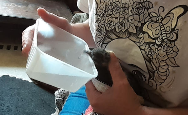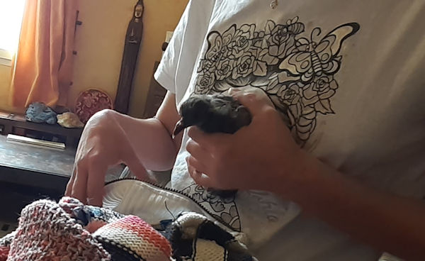 Hier, on est allés à Leroy pour acheter de la peinture. Sur le parking, on a vu à quelques mètres de la voiture un jeune oiseau qui, de toute évidence, n’arrivait pas à voler – il n’avait pas de queue visible. Je me suis arrêté aussitôt et Anti est allée le prendre dans le creux de ses mains. Elle a fait un petit tour du parking pour voir si elle repérait un nid, mais rien. On a alors appelé une amie, Sonia, qui a un vrai amour pour les oiseaux. Elle était ravie, parce qu’elle a un autre pigeon (adulte) qui ne peut pas voler et qui trouvera ainsi un compagnon. Elle nous a donné quelques conseils en attendant que j’aille le conduire à Montpellier chez elle.
