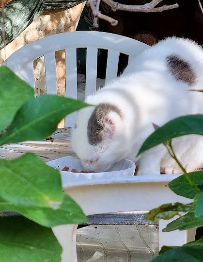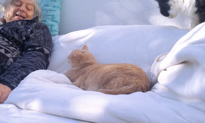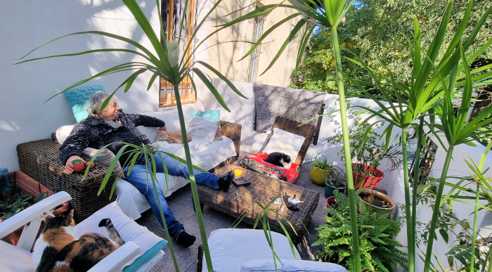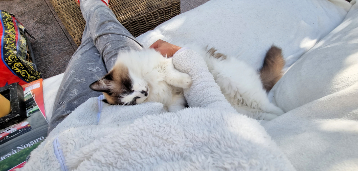 L’été indien se poursuit chez nous. La terrasse à l’arrière de notre jardin est très prisée, même Kiki a fini par nous y rejoindre et il semble apprécier fortement cet emplacement de choix 🙂