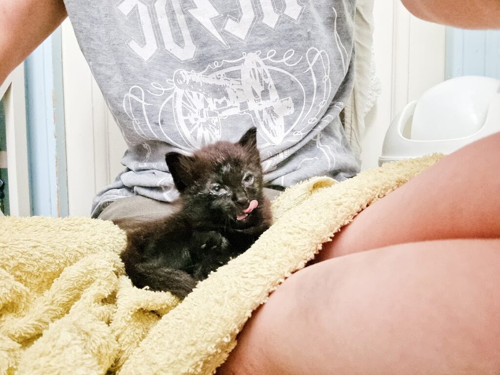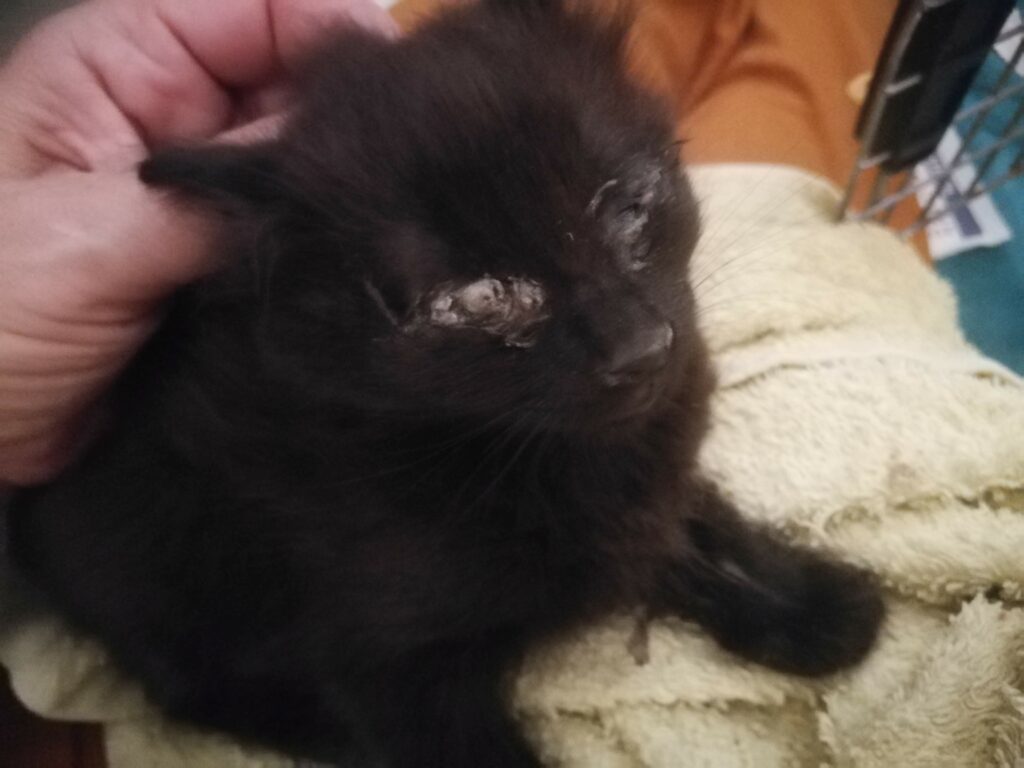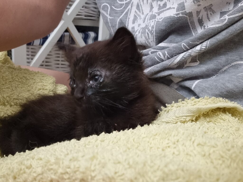 J’arrive sous les coups de 19 h. Il fait encore très, très, très chaud se jour là. Les petitouts sont cachés sous les palettes et le monsieur m’aide à les attraper. Quand je vois dans quel état ils sont, il n’y a aucun doute : on ne peut pas les laisser ainsi, il leur reste à peine quelques jours à vivre. Ils sont tellement pris par le coryza que leurs yeux sont clos, collés par du pus.