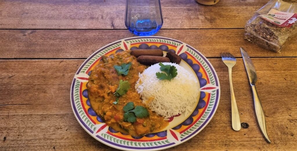 Ce gros morceau de la comptabilité étant terminé, je vais pouvoir lancer une belle flambée et réfléchir à ce que je vais bien pouvoir préparer comme repas. Hier, c’était délicieux : saucisses vegan, riz basmati, korma de légumes, le tout bien assaisonné et accompagné de coriandre fraîche que j’adore.