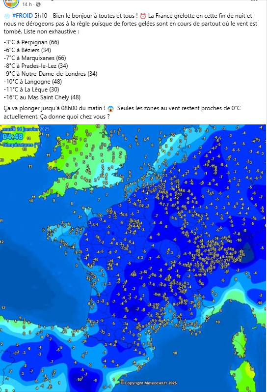 Vous l’avez sans doute remarqué : ÇA CAILLE ! Et ça caille sévère ! Nos amis helvètes nous faisaient part de leur – 9° C dernièrement en Suisse, mais ici aussi, on y est. Regardez plutôt les relevés de Météo Languedoc du 14/01 matin :